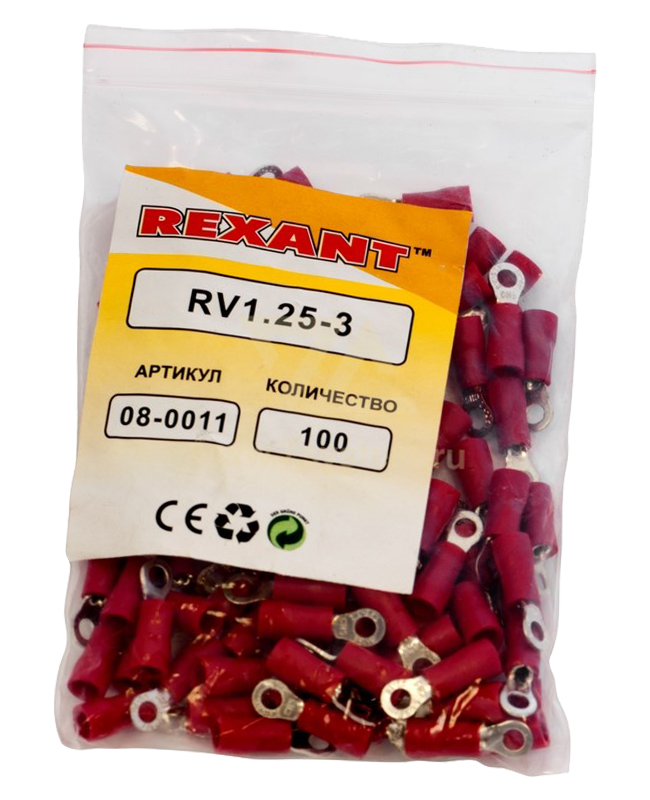Наконечник изолированный кольцевой VR1.25-3 Rexant предназначен для создания качественного подключения электрооборудования, которое осуществляется через контактное соединение на основе винтовой фиксации. Такая клемма используется для оконцовывания многожильных медных проводов при монтаже мобильных электрических контактных соединений на подвижном составе (автомобиле-, вагоно-, самолето- и судостроении) или в других местах, где важна надежность соединения (к примеру, телефонное или климатическое оборудование). Изолированный кольцевой наконечник REXANT состоит из двух компонентов: металлического коннектора и защитного изолятора. Металлический коннектор изготовлен из латуни, с поверхностным электролитическим лужением, а изолятор клеммы из поливинилхлорида (ПВХ), который надежно защищает место обжима кабеля. Обжатие производится специальными пресс-клещами (HT-301 H арт.12-3014, 12-3014; HT-301 N арт.12-3116; HT-301 W арт.12-3021, 12-3021-4) поверх защитного изолятора.