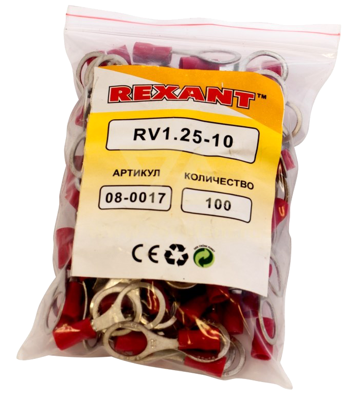 Наконечник изолированный кольцевой VR1.25-10 Rexant предназначен для создания качественного подключения электрооборудования, которое осуществляется через контактное соединение на основе винтовой фиксации. Такая клемма используется для оконцовывания многожильных медных проводов при монтаже мобильных электрических контактных соединений на подвижном составе (автомобиле-, вагоно-, самолето- и судостроении) или в других местах, где важна надежность соединения (к примеру, телефонное или климатическое оборудование). Изолированный кольцевой наконечник REXANT состоит из двух компонентов: металлического коннектора и защитного изолятора. Металлический коннектор изготовлен из латуни, с поверхностным электролитическим лужением, а изолятор клеммы из поливинилхлорида (ПВХ), который надежно защищает место обжима кабеля. Обжатие производится специальными пресс-клещами (HT-301 H арт.12-3014, 12-3014; HT-301 N арт.12-3116; HT-301 W арт.12-3021, 12-3021-4) поверх защитного изолятора.