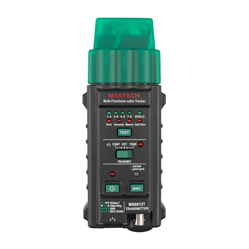 Искатель кабельных пар MS6813T Mastech (Тестер с генератором сигнала) — универсальный прибор с большим количеством функций. Предназначен для обнаружения скрытой проводки, как рабочей, так и поврежденной, экранированной и неэкранированной витой пары, проверки коаксиального кабеля, тестирования телефонной линии и LAN кабеля, проверки целостности и конфигурации сети, выявления замкнутых и разомкнутых кабелей, выявления разрывов цепи и коротких замыканий.
