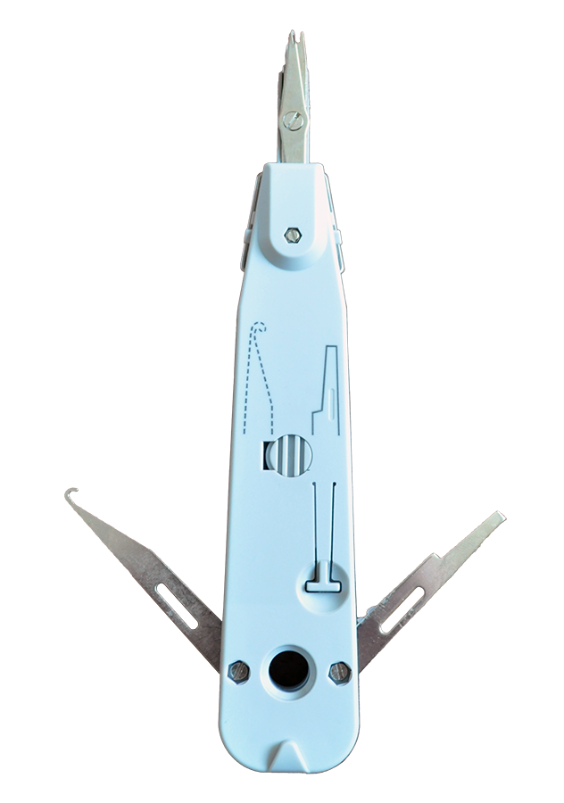 В рукоятку встроены инструменты для работы с проводниками/плинтами: Крючок для извлечения жил из контактов. Демонтажный клинок для снятия плинта типа Krone с монтажного хомута.