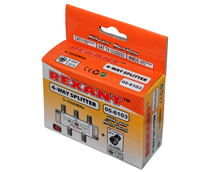 Делитель на 4 в упаковке 4-WAY Splitter Silver (+ 5 F-разъемов) Rexant