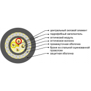 Кабель содержит сердечник модульной конструкции с центральным силовым элементом из стеклопластикового прутка, вокруг которого скручены оптические модули методом правильной SZ-скрутки. Внутри оптических модулей свободно уложены оптические волокна. Свободное пространство внутри оптических модулей и межмодульное пространство заполнено гидрофобным заполнителем. Сердечник скреплен нитями. На сердечник наложена ПЭТ-лента, закрепленная нитью. Поверх сердечника накладывается промежуточная оболочка из полиэтилена. Поверх оболочки накладывается броня из стальных оцинкованных проволок. Свободное пространство между промежуточной оболочкой и элементами бронепокрова заполняется гидрофобным компаундом. Поверх проволочной брони накладывается защитная оболочка из полиэтилена высокой плотности. В случае изготовления кабеля с повышенными требованиями по пожарной безопасности оболочка кабеля выполняется из безгалогенного негорючего компаунда.