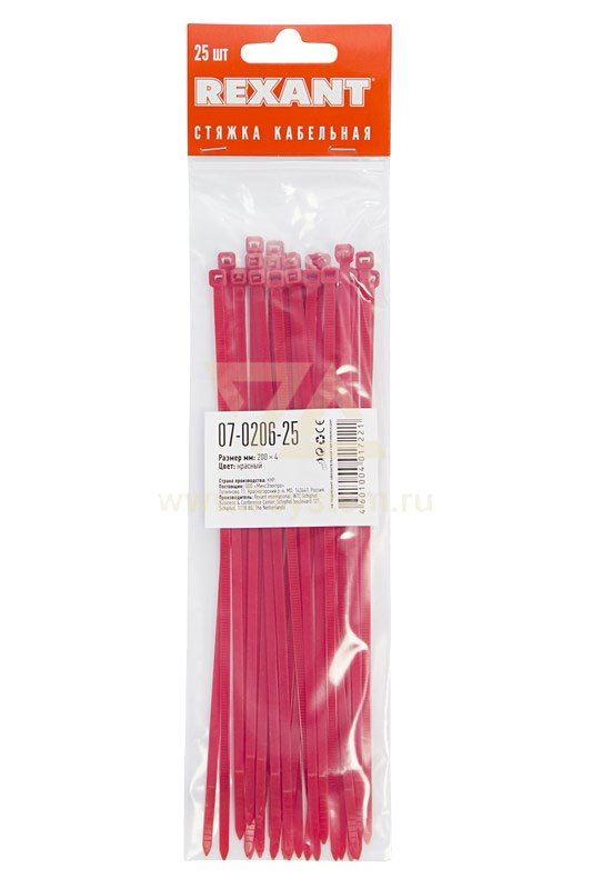 Хомут 200 мм x 3, 6 мм Rexant, красный, 25 шт