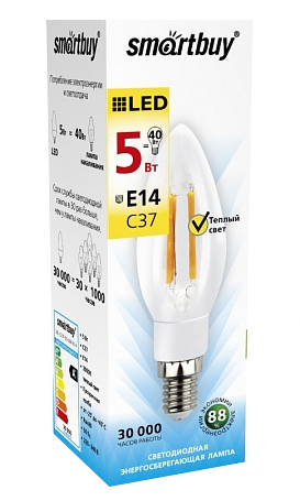 Лампа LED C37 Filament Smartbuy, Е14, 5 Вт / 40 Вт, 3000 К, тепло-белая