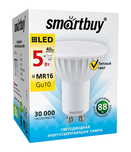 Лампа LED MR16 Smartbuy, Gu10, 5 Вт / 40 Вт, 3000 К, тепло-белая