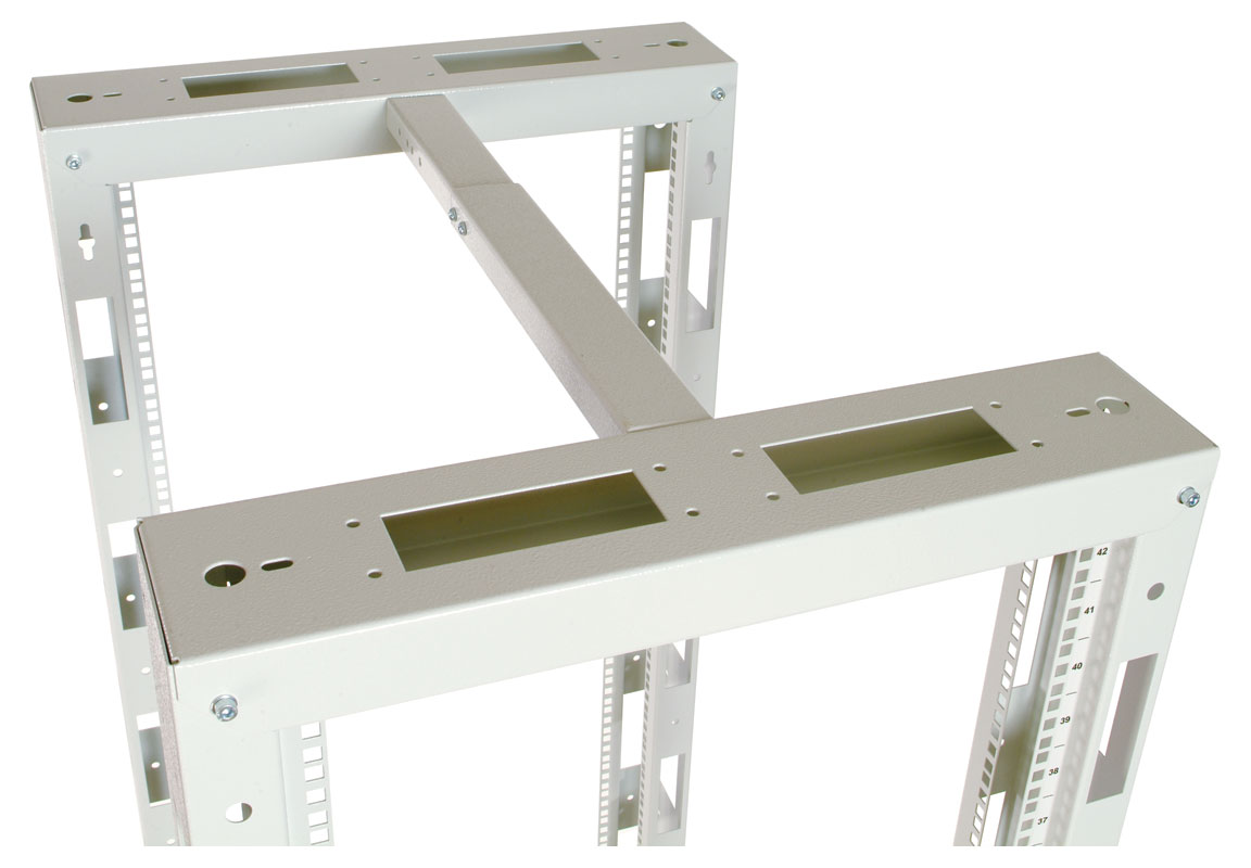 Универсальные стойки 19" имеют полностью разборную двухрамную конструкцию, каркас повышенной жесткости скреплен болтами с внутренними шестигранниками. Вертикальные направляющие имеют юнитовую маркировку. Для удобства монтажа и коммутации оборудования предусмотрены развитая перфорация, широкий спектр аксессуаров и система заземления. Двухрамная универсальная стойка 19" имеет регулировку полезной глубины – 750/620/580/450. При организации крупных коммутационных узлов возможно крепление стоек между собой через вертикальный кабельный органайзер. Удобство установки обеспечивают массивные опорные кронштейны и регулируемые винтовые опоры (ножки), компенсирующие неровности пола.