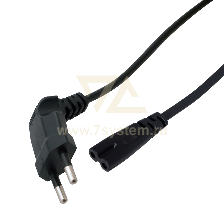 Данный сетевой шнур (IEC cord) состоит из двухжильного провода с сечением жил 0.5мм², с одной стороны угловой литой плоской вилки (Евро) и с другой литого гнездового неполяризованного разъёма типа C7 (евро-разъём).