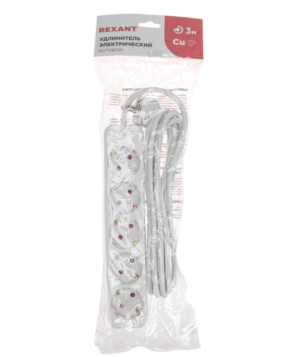 Удлинитель 5 гнезд 3 х 1.0 мм Standart Rexant, c/з, белый, 3 м для подключения электрических приборов, когда недостаточно стандартной длины шнура для питания от стационарных розеток.