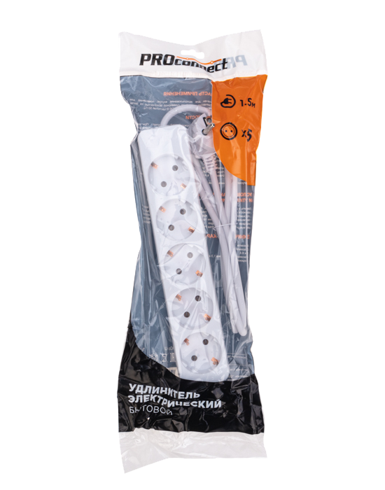 Удлинитель 5 гнезд, 3 х 0, 75 мм, Proconnect, с/з, белый 1, 5м предназначен для подключения электрических приборов и электроинструментов в быту, когда недостаточно стандартной длины шнура для питания от стационарных розеток.