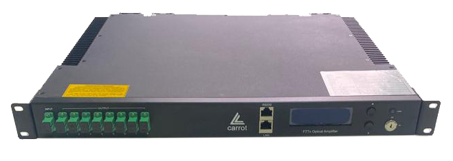 WE1550EDFA-8-23 Carrot — оптический усилитель EDFA обеспечивает усиление мощности оптических сигналов, без их преобразования в электрические сигналы и обратно, обладает низким уровнем шумов. Усилители EDFA выполнены в 19" корпусе 1U для размещения в стандартной телекоммуникационной стойке. Локальное управление оптическим усилителем осуществляется через порт RS-232 или с помощью встроенного жк-экрана и кнопок на лицевой панели. Удаленное управление и мониторинг осуществляют по WEB и протоколу SNMP.